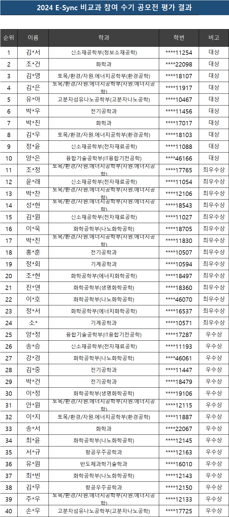 2024 E-Sync 비교과 참여 수기 공모전 평가 결과 JBNU IE2025-02-03조회 1117 이전글 2025학년도 1학기 에너지신산업 교과 운영 안내 다음글 사업단 근로장학생 모집 목록보기