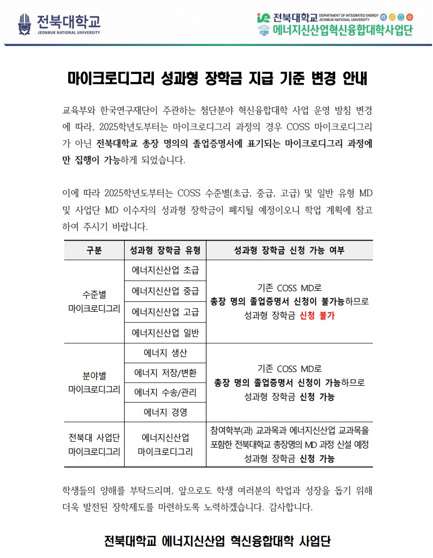 (필독)마이크로디그리 성과형 장학금 지급 기준 변경 안내 정현남2025-03-26조회 1010 마이크로디그리 성과형 장학금 지급 기준 변경 사항을 안내합니다. 이전글 성과형 장학금 지침 개정 안내(2025.03.25.) 다음글 다음글이 없습니다. 목록보기