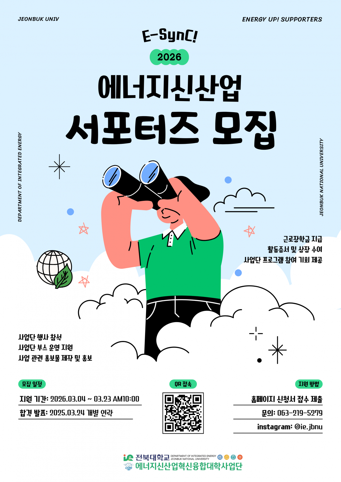 E-SynC! 2026 에너지신산업 서포터즈를 모집하오니 많은 참여 바랍니다.